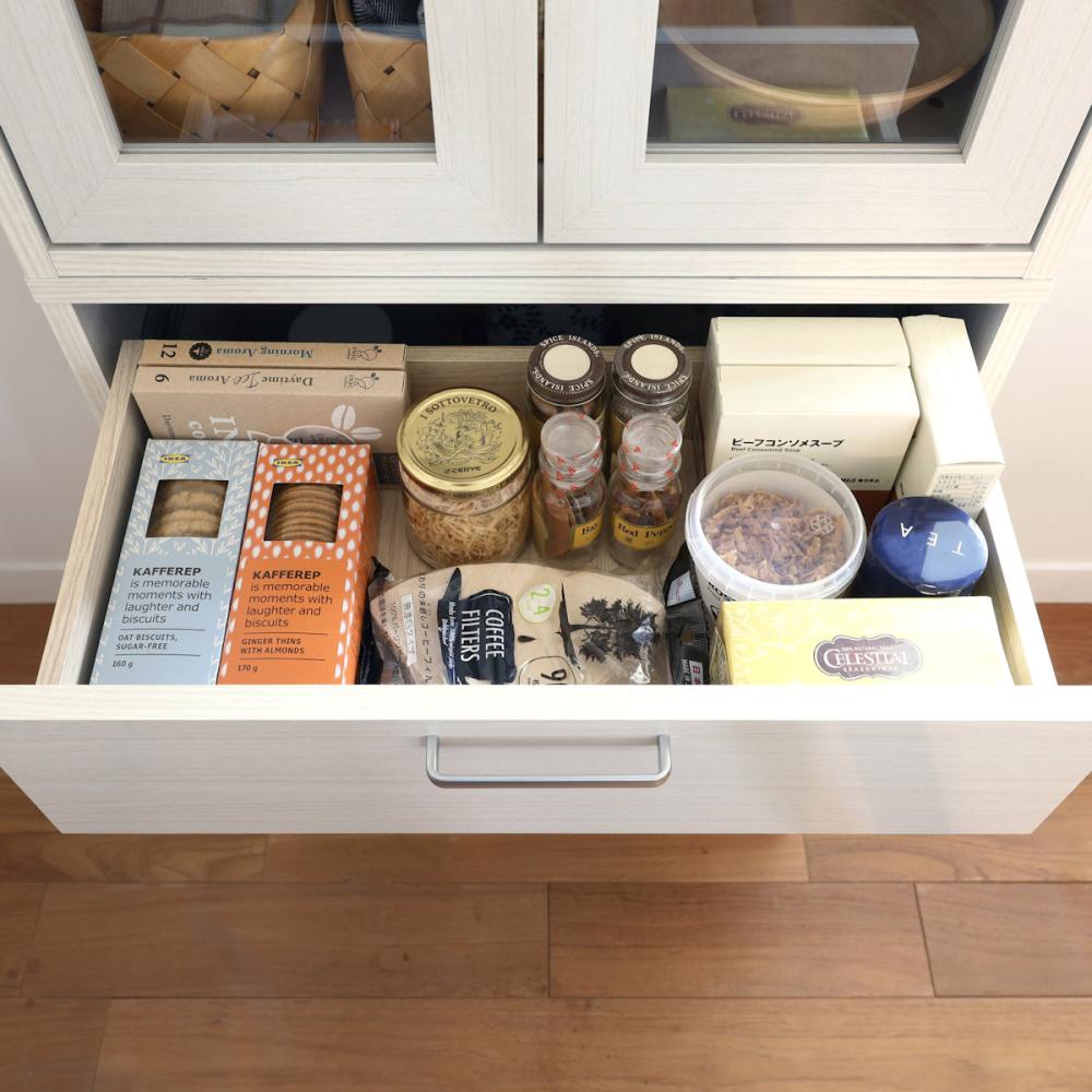 ■小物の収納に便利な引き出し付き。カトラリーやリビング小物の収納に便利です。