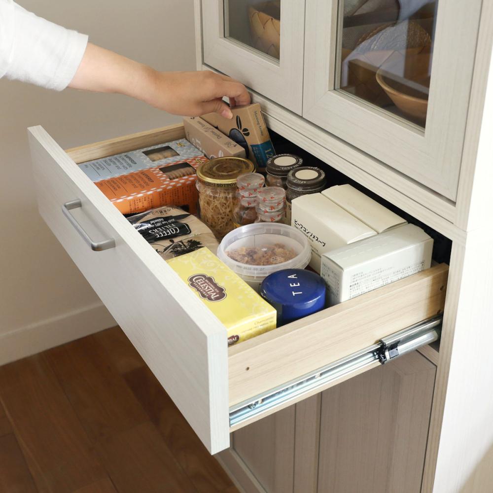 引き出しにはフルスライドレールを使用。全部引き出せるから、奥にしまった物も取り出しやすくなっています。