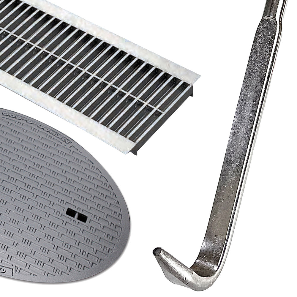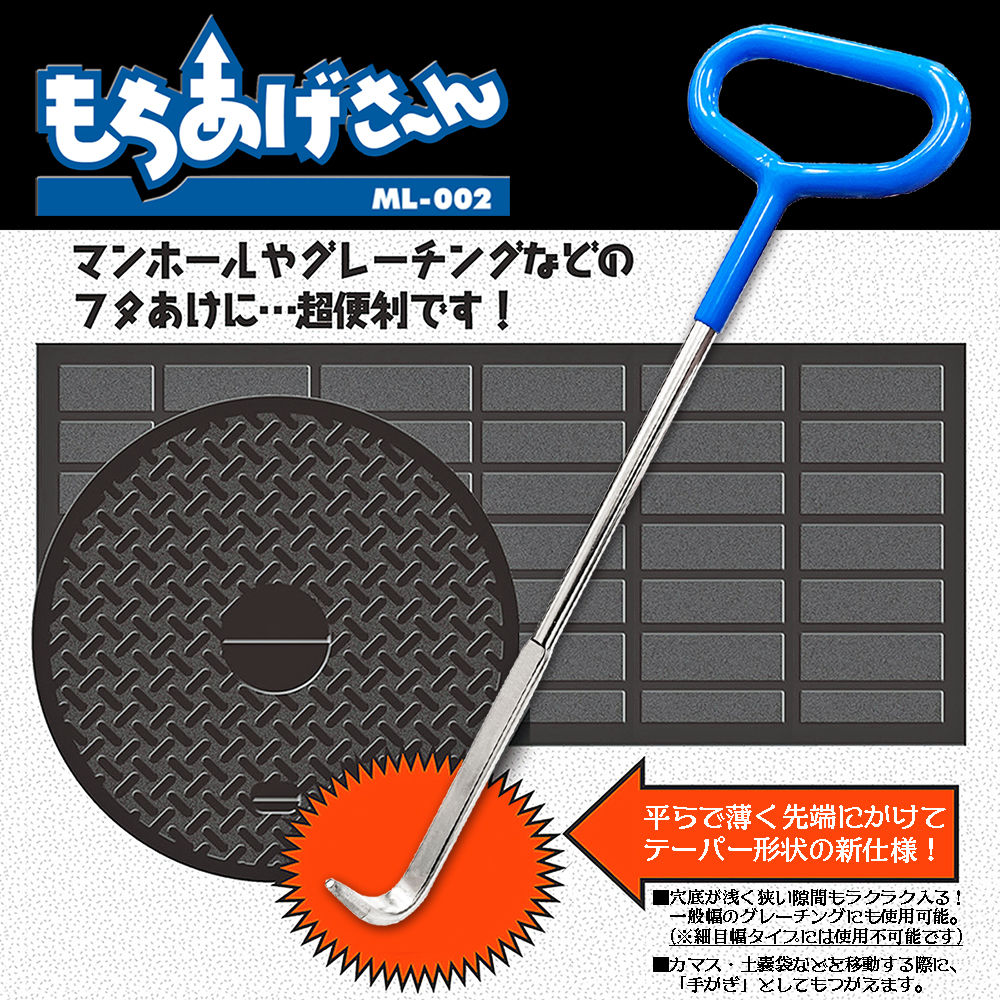 ●材質:S-50C、仕上:ニッケルメッキ、ハンドルカバー:PVC ●吊り耐荷重:30kg ●生産国:日本 注意事項 ・先端が尖っていますのでお取り扱いには十分注意してください。 ・製品は十分な吊り耐荷重をもっておりますが、あくまでも手で作業する道具として製造されております。機械や重機に取り付けての作業は絶対におやめください。 ・細目幅のグレーチングには使用出来ません。細目幅のタイプの持ち上げ作業は「もちあげ君」をお使い下さい。