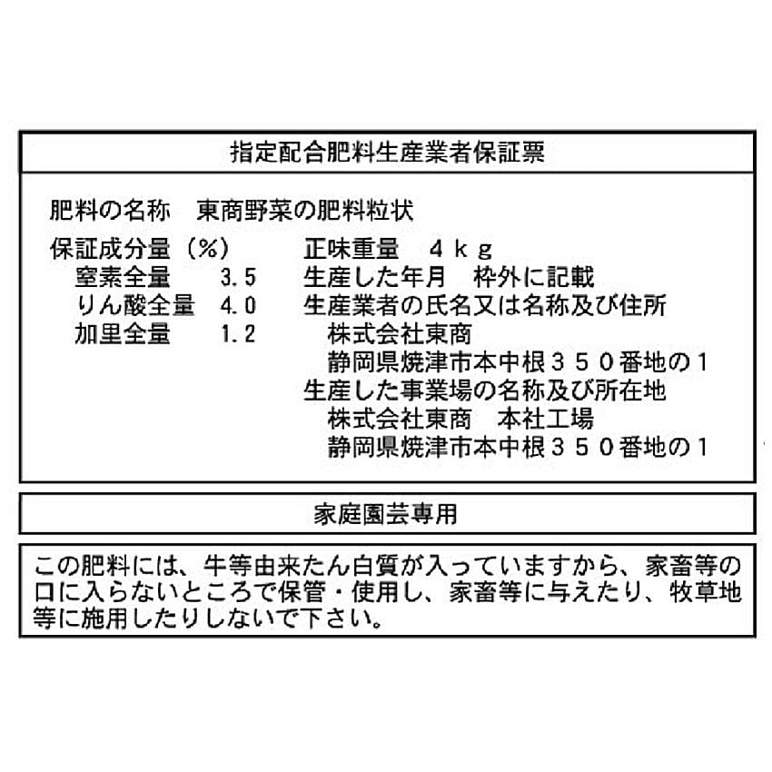 ※この肥料には、牛等由来たん白質が入っていますから、家畜等の口に入らないところで保管・使用し、家畜等に与えたり、牧草地等に施用したりしないで下さい。