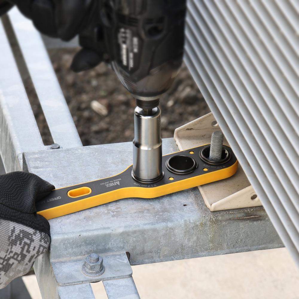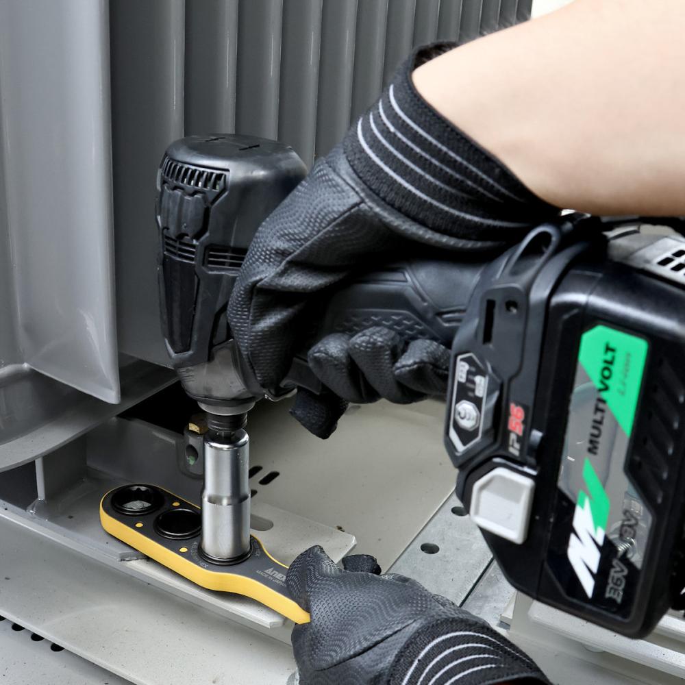 製品特徴 ●手回しのスパナしか入らない狭い所のボルト回しを電動で回せるアタッチメント ●建築の胴縁や胴差しなど狭いスペースでのボルト・ナット回し作業に ●内部ギヤ構造が狭い所の奥へ電動ドライバーの力を伝えます ●別売りAOA-17専用ソケットを出力部に取り付ければ、H8~H21までのボルトに対応します 用途 ●電気設備の架台、ダクトレール周りのボルトに 仕様 ●入力部:H17六角、6.35六角 出力部:H17六角(二重六角) ●40V対応(18Vにも対応) ●材質:炭素鋼、合金鋼、PP、TPE
