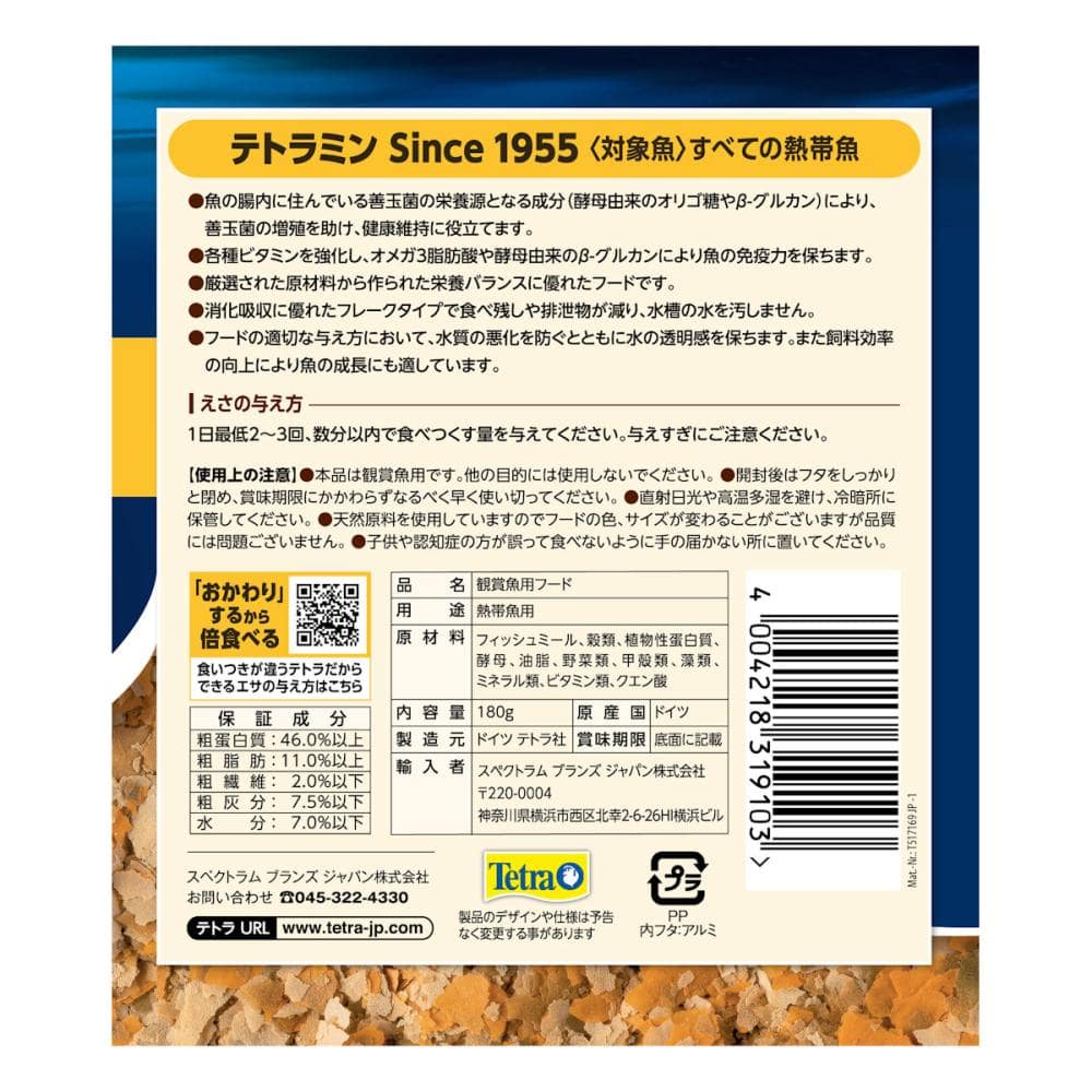 お取り扱い上の注意:本品は観賞魚用です。他の目的には使用しないでください。開封後はフタをしっかりと閉め、賞味期限にかかわらずなるべく早く使い切ってください。天然原料を使用してますのでフードの色、サイズが変わることがございますが品質には問題ございません。子供や認知症の方が誤って食べないように手の届かないところにおいてください。