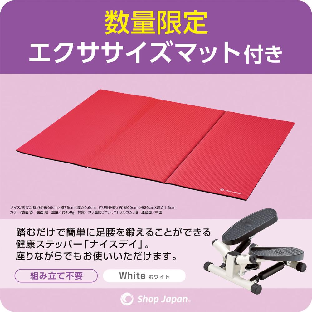 足腰イキイキ!踏むだけで簡単に足腰を鍛えることができる健康ステッパー「ナイスデイ」。 【ナイスデイ本体】 コンパクトなので、ハンカチ1枚分のスペースで使用可能!座りながらでもお使いいただけます。 カラー:ホワイト 材質:スチール 他 耐荷重:100kg 【エクササイズマット】 表は赤、裏は黒のリバーシブルで使えるエクササイズマット。三つ折りで収納可能で床のキズ防止と滑り防止に最適。 サイズ/広げた時:約 縦60×横78×厚さ0.6cm 折り畳み時:約 縦60×横26×厚さ1.8cm 重量:約450g 材質:ポリ塩化ビニル、ニトリルゴム 他