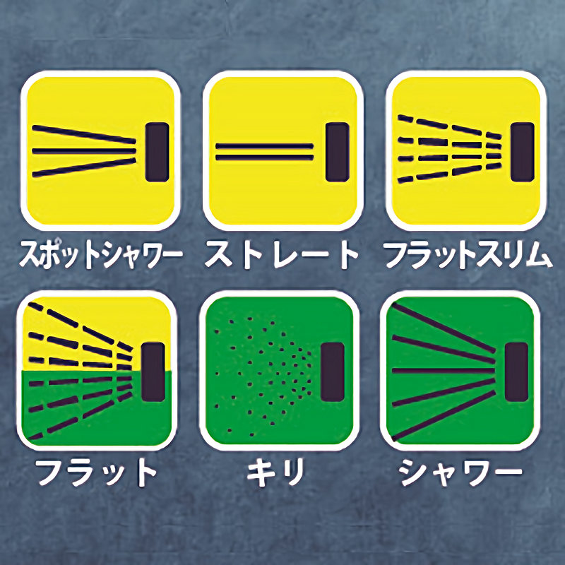 水流パターン:スポットシャワー、ストレート、スリムワイド、ワイド、キリ、シャワー