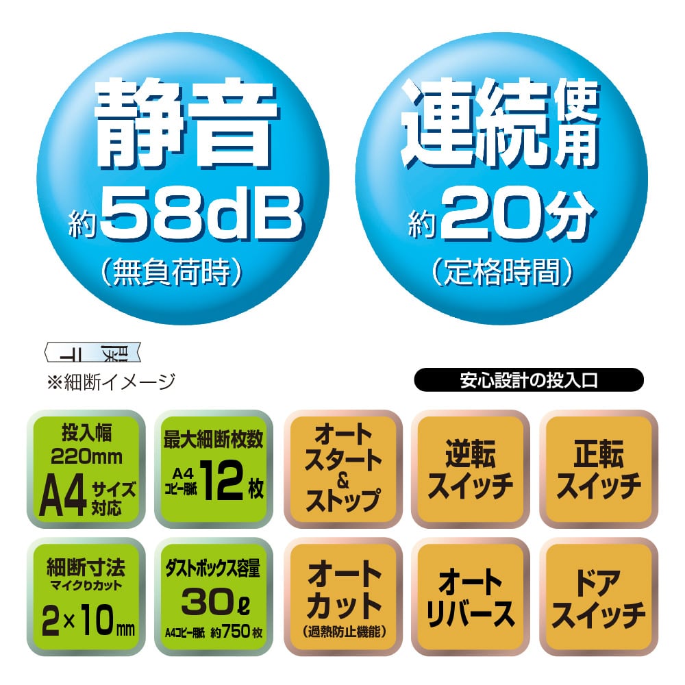 ●最大細断枚数:12枚(A4上質紙)※郵便はがき/1枚(厚み0.2mmまで)