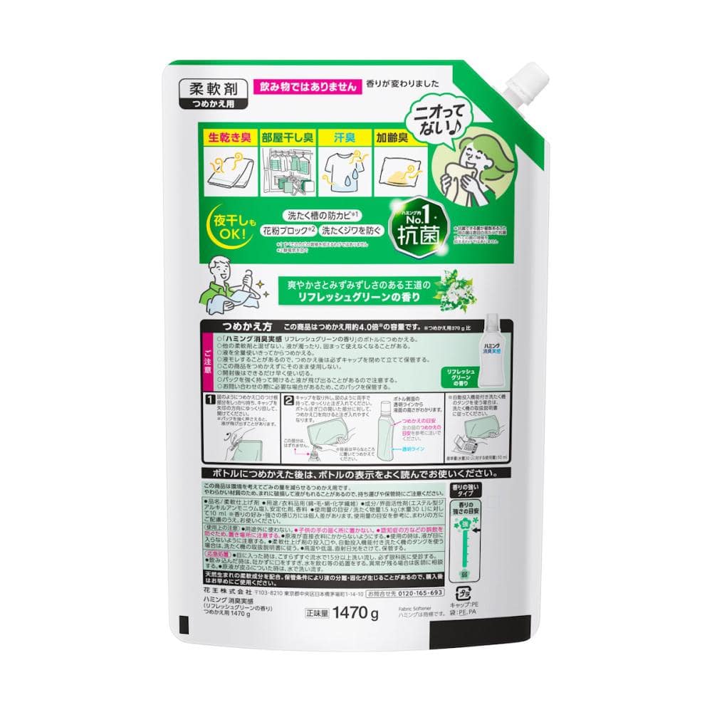 使用上の注意:つめかえ方 ご注意 ○「ハミング消臭実感 リフレッシュグリーンの香り」のボトルにつめかえる。 ○他の柔軟剤と混ぜない。液が濁ったり、固まって使えなくなることがある。 ○液を全量使いきってからつめかえる。 ○液モレすることがあるので、つめかえ後は必ずキャップを閉めて立てて保管する。 ○この商品をつめかえずにそのまま使用しない。 ○開封後はできるだけ早く使い切る。 ○パックを強く持って開けると液が飛び出ることがあるので注意する。 ○お問い合わせの際に必要な場合があるため、このパックを保管する。 使用上の注意 ●用途外に使わない。 ●子供の手の届く所に置かない。 ●認知症の方などの誤飲を防ぐため、置き場所に注意する。 ●原液が直接衣料にかからないようにする。 ●使用の時は、液が目に入らないように注意する。 ●柔軟仕上げ剤の投入口や、自動投入機能付き洗たく機のタンクを使う場合は、洗たく機の取扱説明書に従う。 ●高温や低温、直射日光をさけて、保管する。
