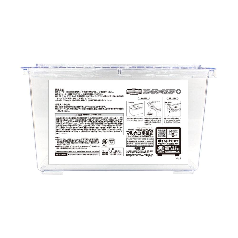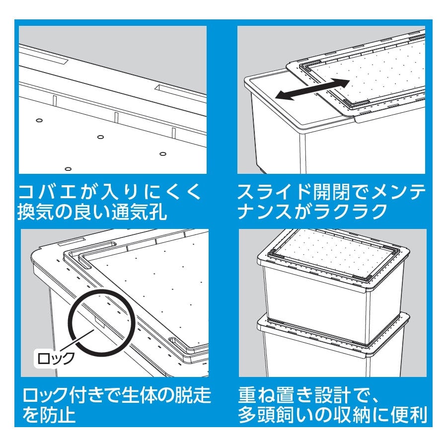 お取り扱い上の注意:・本品は昆虫や小型水棲動物用の飼育用品です。他の目的には使用しないでください。・ケースを移動させる場合は、必ずケース本体の底を持って移動してください。フタを持って移動すると、フタが外れて落下し、人やペットがケガをする恐れがあります。・火気や暖房器具のそばに置いたり、熱湯をかけたりしないでください。火災、人やペットのヤケド、製品の変形の原因となる場合があります。・直射日光の当たる所には置かないでください。生体が死んだり、プラケース本体が変形するばかりではなく、レンズ作用による火災の恐れがあります。