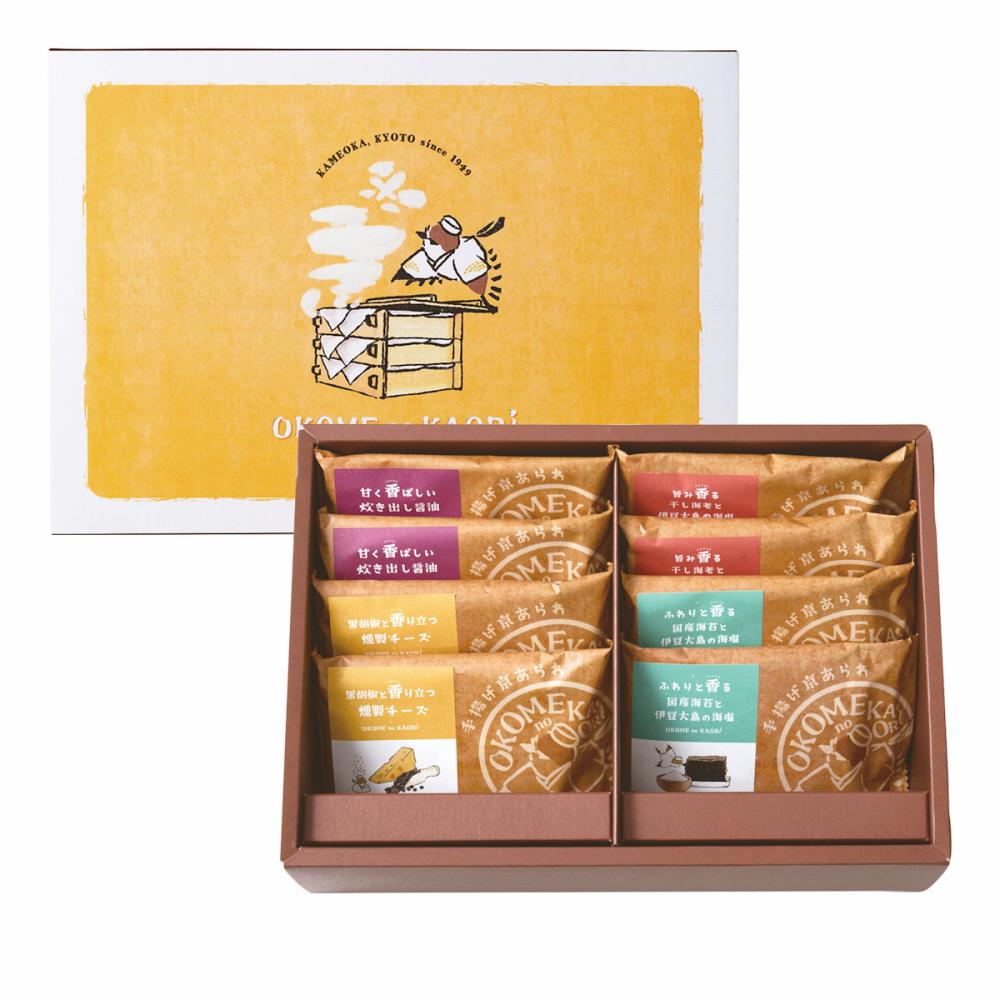 ■内容量:手揚げ京あられ×8袋(旨み香る干し海老と伊豆大島の海塩14g・甘く香ばしい炊き出し醤油15g・ふわりと香る国産海苔と伊豆大島の海塩15g・黒胡椒と香り立つ燻製チーズ12g×各2袋)