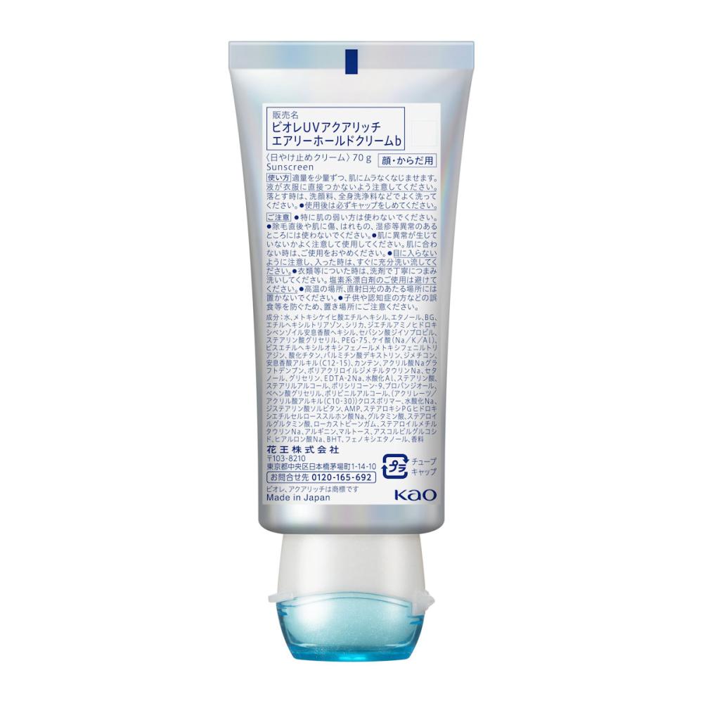 使用上の注意:ご注意 使用前 ●特に肌の弱い方は使わないでください。 ●除毛直後や肌に傷、はれもの、湿疹等異常のあるところには使わないでください。 使用時 ●肌に異常が生じていないかよく注意して使用してください。肌に合わない時、使用中に赤み、はれ、かゆみ、刺激、色抜け(白斑等)や黒ずみ等の異常が出た時、直射日光があたって同様の異常が出た時は使用を中止し、皮フ科医へ相談してください。使い続けると症状が悪化することがあります。 ●目に入らないように注意し、入った時は、すぐに充分洗い流してください。 ●衣類等につかないよう充分ご注意ください。つけた後のお肌が、衣類や車のシート等とこすれた時などは、衣類等に白く残ることがあります。 ●衣類等についた時は、すぐに洗剤で丁寧につまみ洗いしてください。また、ついた部分がピンク等に変色(着色)する場合がありますので、塩素系漂白剤のご使用は避けてください。 ●UVカット成分を含んだアクアカプセルが白い粒として見えることがありますが、品質などに問題はありません。 保 管 ●高温の場所、直射日光のあたる場所には置かないでください。 ●子供や認知症の方などの誤食等を防ぐため、置き場所にご注