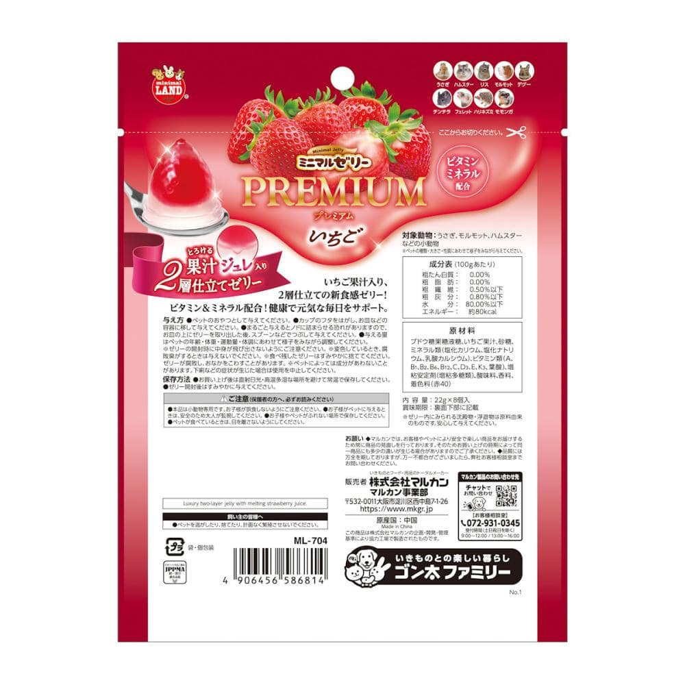 お取り扱い上の注意:●本品は小動物専用です。お子様が誤食しないようにご注意ください。●お子様がペットに与えるときは、安全のため大人が監視してください。●お子様やペットがふれない場所で保存してください。●ペットが食べているときは、目を離さないようにしてください。食べ残したゼリーはすみやかに捨ててください。ゼリーが腐敗し、おなかをこわすことがあります。