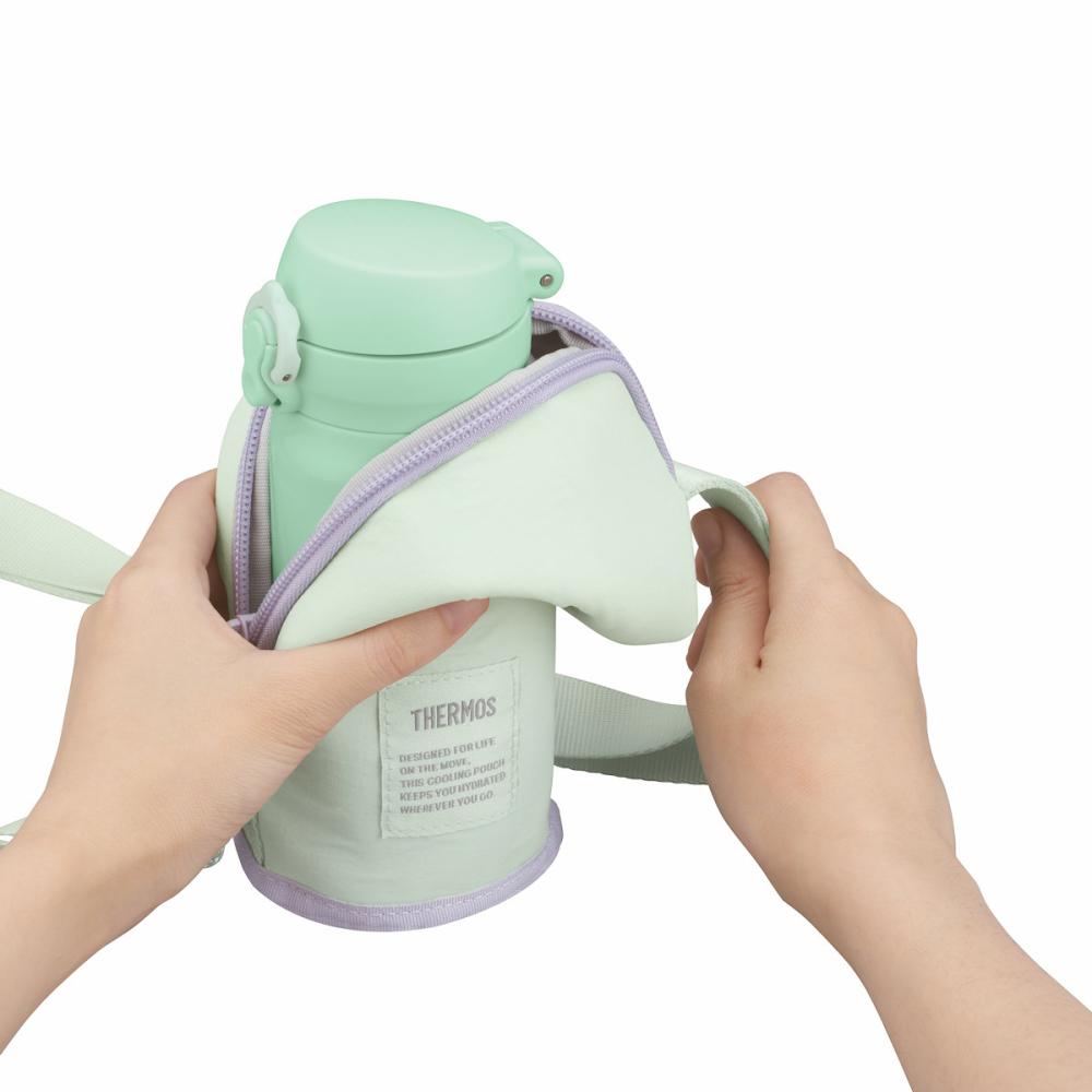 幅6.5cm以下、高さ19.5cm以下のサーモス製真空断熱ボトルに対応しています。 ※シリコーンゴムの底カバーは外してご使用ください。 ■冷たさを運ぶIsoTec断熱構造。保冷バッグとしても使える ■ポーチに入れたまま飲める ■汚れをふき取りやすい内生地(PEVA) ■洗濯機OK