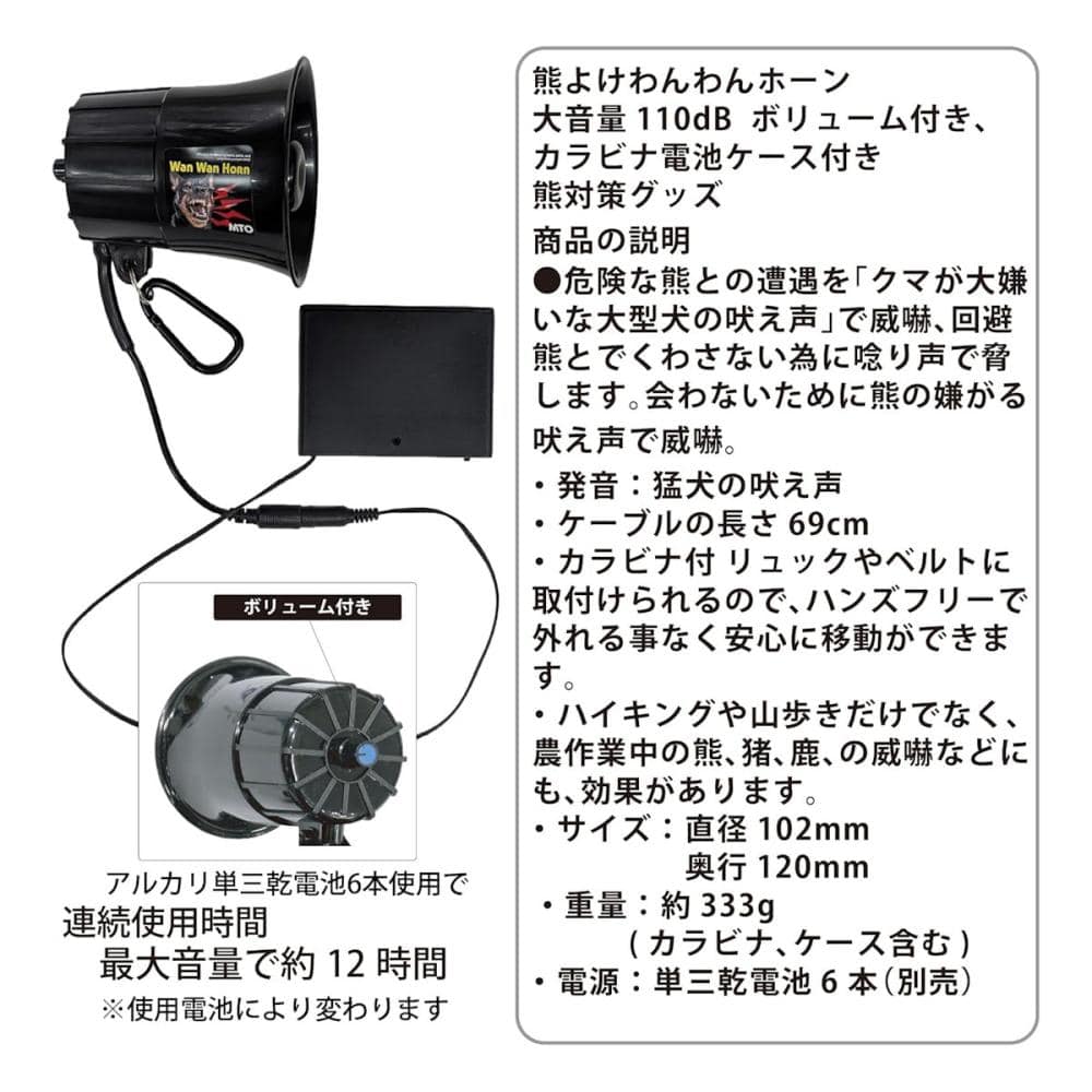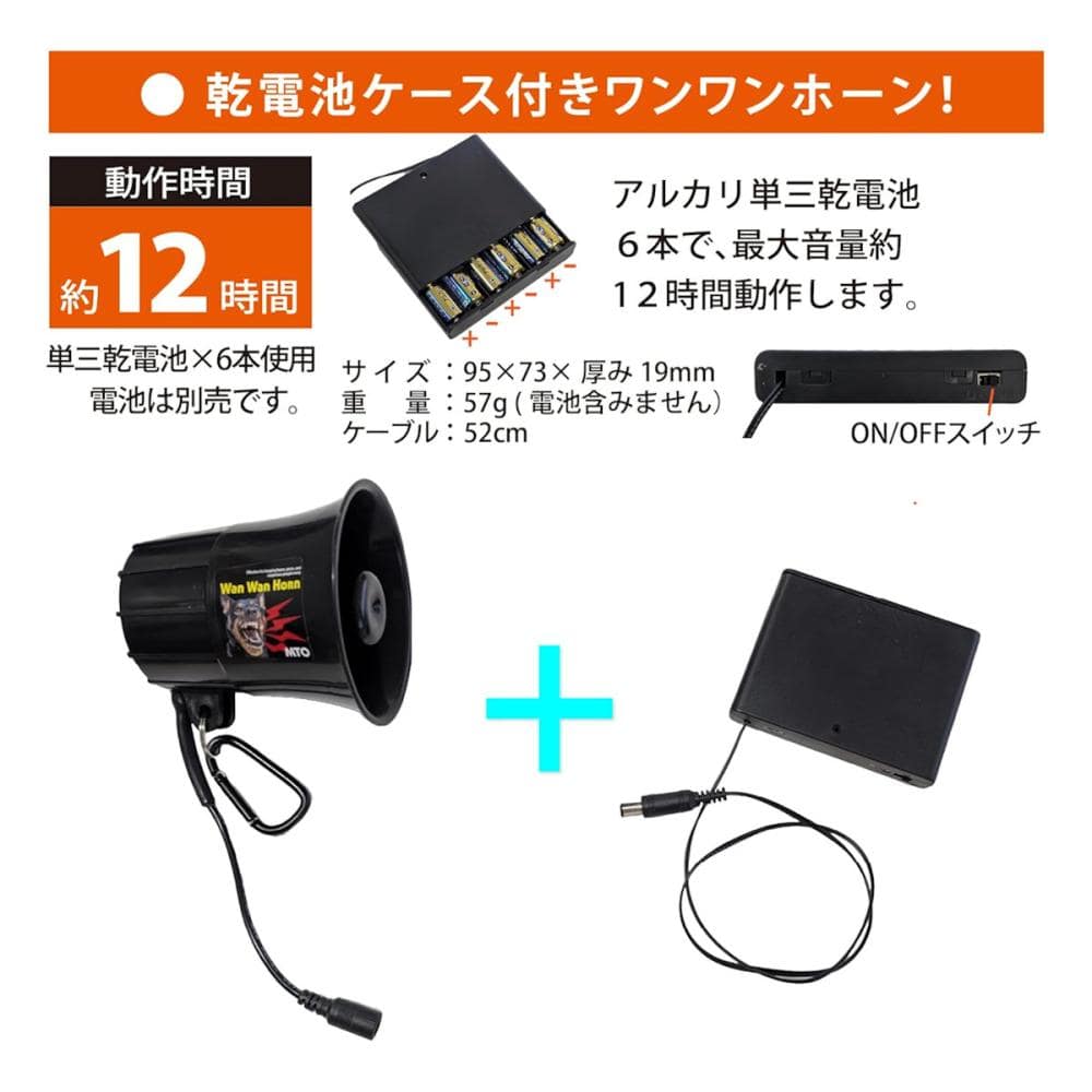 乾電池ケース付きわんわんホーン アルカリ単三乾電池6本で、最大音量約12時間動作します。 110db