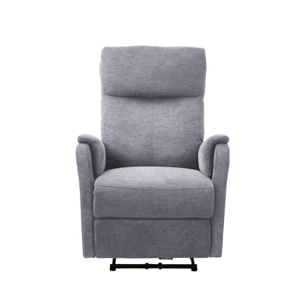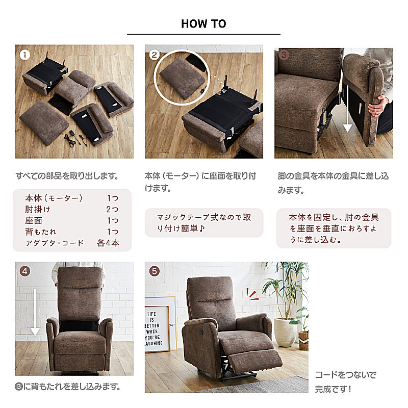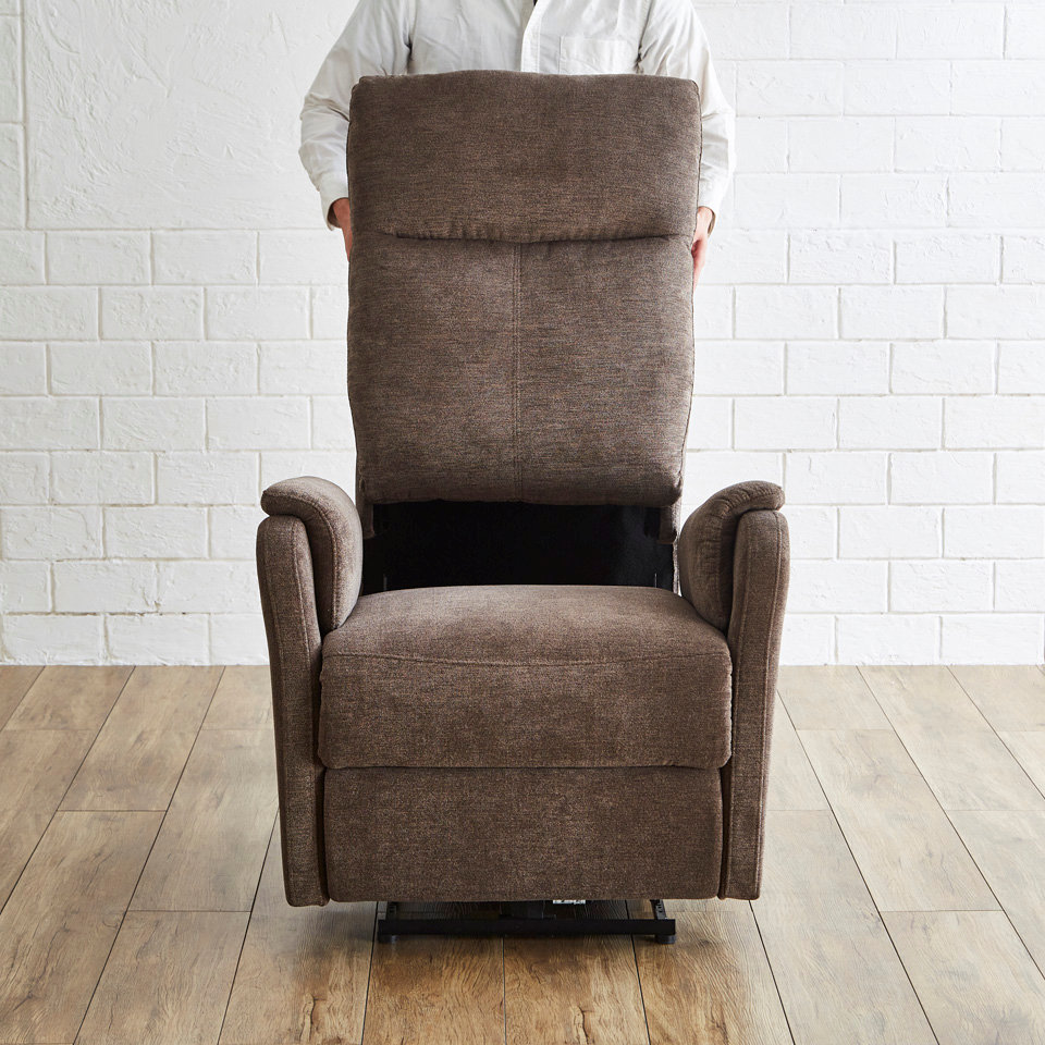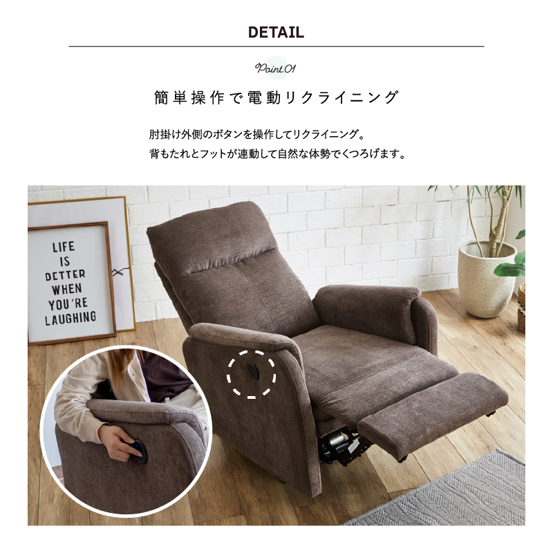 肘掛け外側のボタンを押して上げ下げするだけで簡単にリクライニングできます。背もたれとフットレスが連動してリクライニングし、自然な体勢でくつろげます。