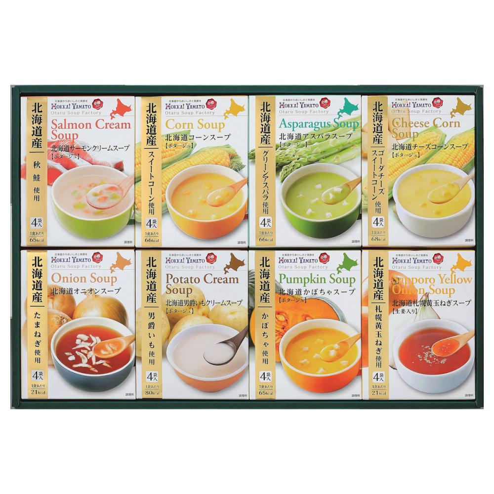 内容量:サーモンクリームスープ(17.2g×4袋)、コーンスープ(16.5g×4袋)、アスパラスープ(16.5g×4袋)、札幌黄玉ねぎスープ(7g×4袋)、かぼちゃスープ(16.5g×4袋)、オニオンスープ(7g×4袋)、チーズコーンスープ(16.5g×4袋)、男爵いもクリームスープ(20g×4袋)、各1箱