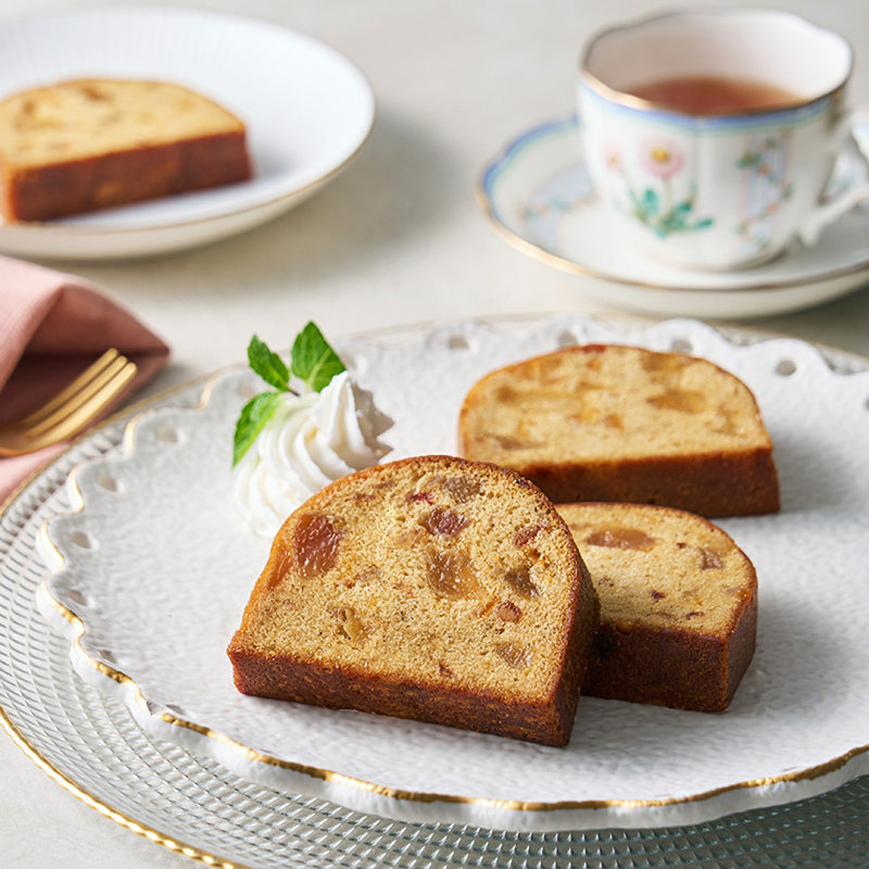 7種類のフルーツを洋酒に漬け込み、紅茶の生地でくるんだ、フルーツが詰まったパウンドケーキ。ひとくち食べ進めていくごとに、7種のフルーツそれぞれの味わいを楽しめる、ホテルシェフならではのデザートに仕上げました。