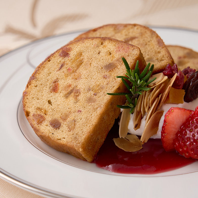 7種類のフルーツを洋酒に漬け込み、紅茶の生地でくるんだ、フルーツが詰まったパウンドケーキ。ひとくち食べ進めていくごとに、7種のフルーツそれぞれの味わいを楽しめる、ホテルシェフならではのデザートに仕上げました。