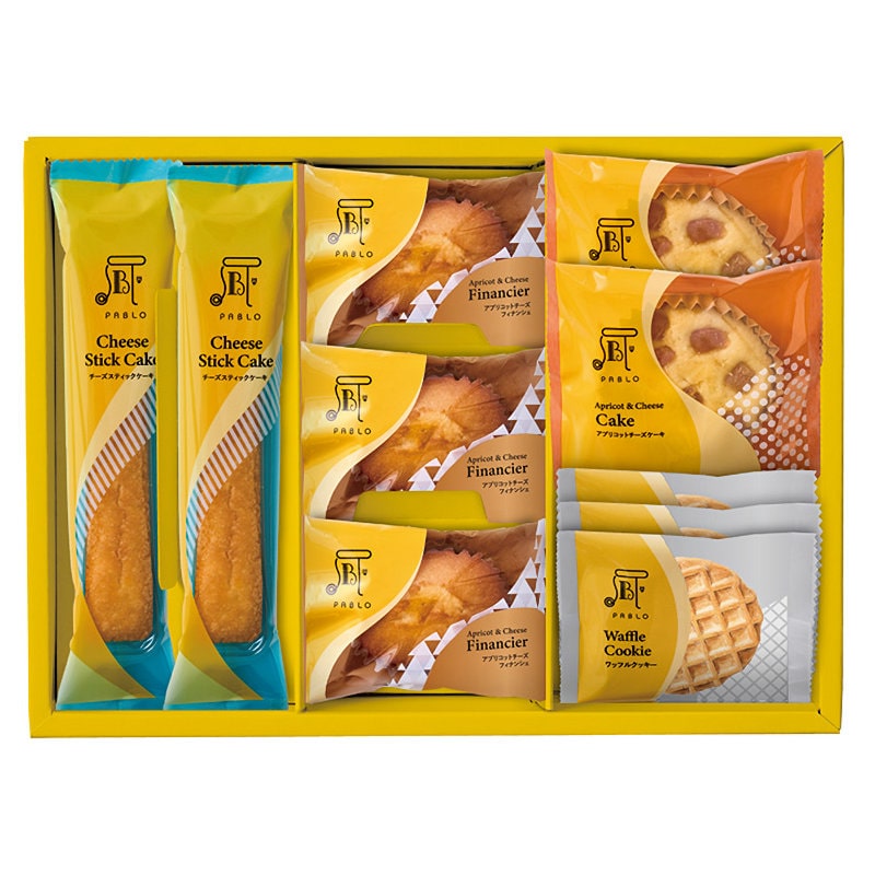 内容量:アプリコットチーズフィナンシェ×3個、アプリコットチーズケーキ×2個、チーズスティックケーキ×2個、ワッフルクッキー×3個