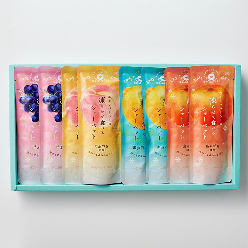 島そだち・瀬戸内レモン・福島のあかつき(白桃)・ピオーネと、日本の豊かな気候で育った国産フルーツ果汁を使用した贅沢なジュレを凍らせて食べるシャーベット。まるでフルーツを食べているかのような濃厚な甘みや爽やかな酸味が口いっぱいに広がります。冷やすとゼリーとして味わえるのも魅力的です。