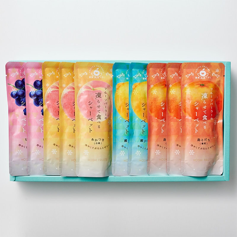 島そだち・瀬戸内レモン・福島のあかつき(白桃)・ピオーネと、日本の豊かな気候で育った国産フルーツ果汁を使用した贅沢なジュレを凍らせて食べるシャーベット。まるでフルーツを食べているかのような濃厚な甘みや爽やかな酸味が口いっぱいに広がります。そのままゼリーとして味わえるのも魅力的です。