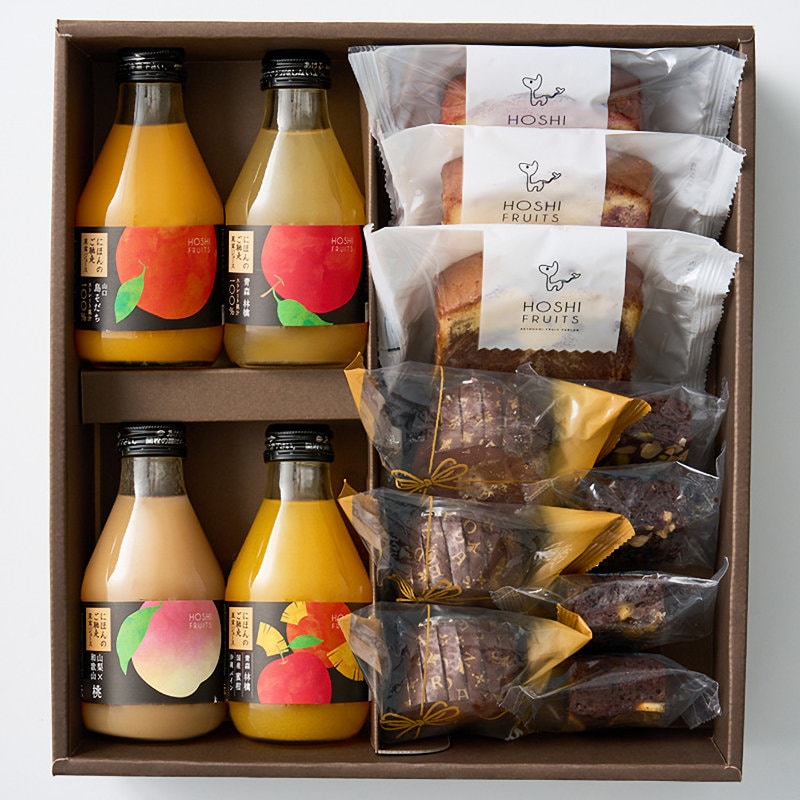 内容量:ジュース(山口島そだち・青森林檎・山梨 和歌山桃・ミックスジュース(国産蜜柑・沖縄パイン・青森林檎))×各1本 各180mL、カップケーキ(オレンジ・マロン・パインココナッツ)×各1個、パウンドケーキ(オレンジピール×チョコ・ブルーベリー×クリームチーズ・いちご×アールグレイ)×各1個、ブラウニー(ネーブル・パイナップル・ドライフルーツ&ナッツ・ピス