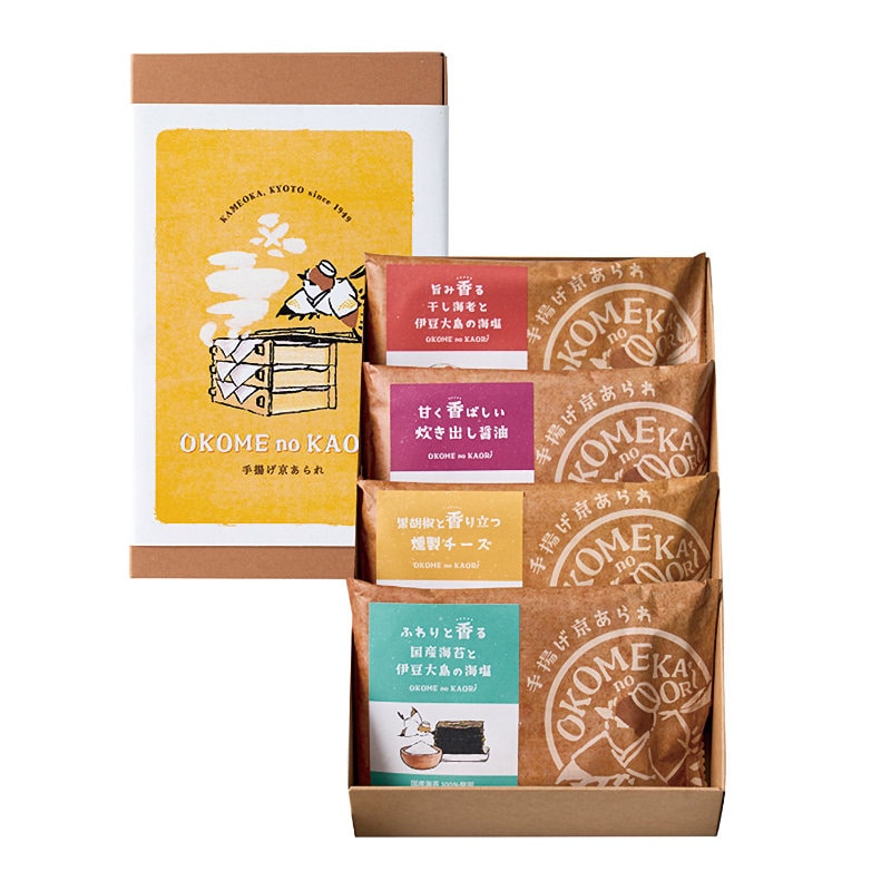 内容量:手揚げ京あられ×4袋(旨み香る干し海老と伊豆大島の海塩14g・甘く香ばしい炊き出し醤油15g・ふわりと香る国産海苔と伊豆大島の海塩15g・黒胡椒と香り立つ燻製チーズ12g×各1