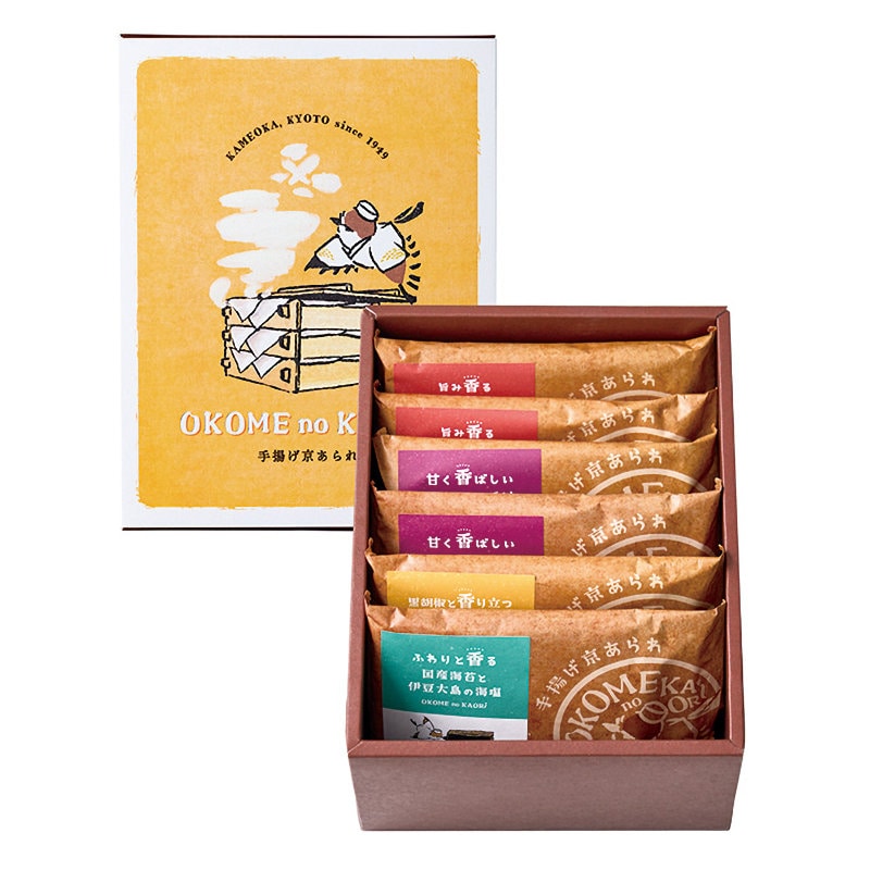 内容量:手揚げ京あられ×6袋(旨み香る干し海老と伊豆大島の海塩14g・甘く香ばしい炊き出し醤油15g×各2袋、ふわりと香る国産海苔と伊豆大島の海塩15g・黒胡椒と香り立つ燻製チーズ12