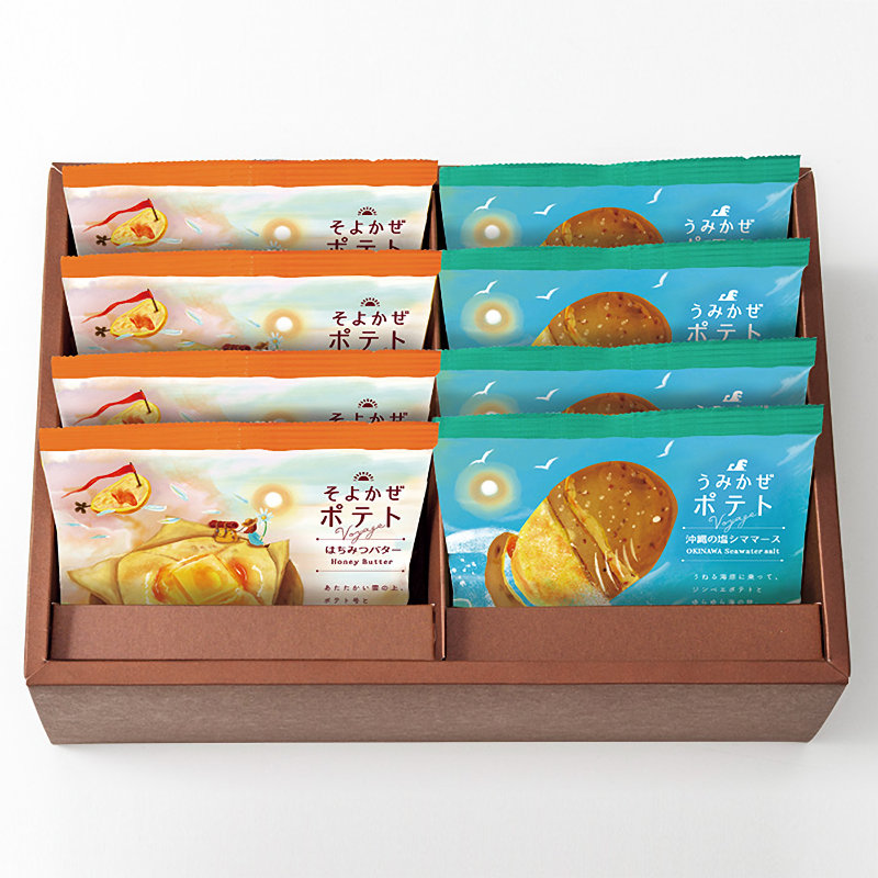 内容量:うみかぜポテト(沖縄の塩シママース)、そよかぜポテト(はちみつバター)×各16g×4袋:乳
