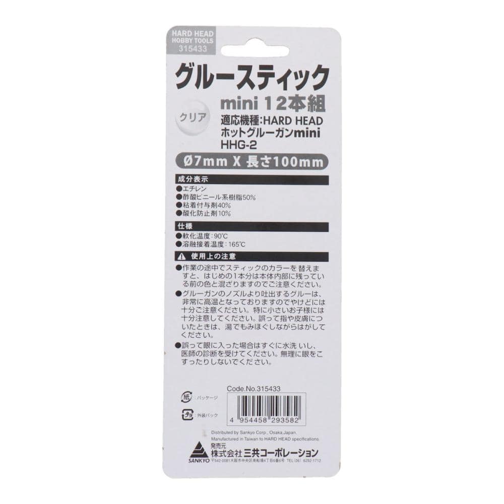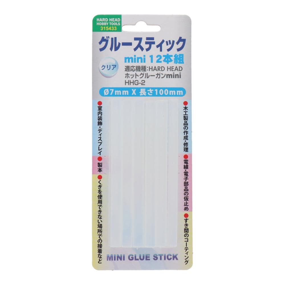 【用途】 ●木工製品の作成・修理 ●電線・電子部品の仮止め ●すき間のコーティング ●室内装飾・ディスプレイ ●製本 ●くぎを使用できない場所での接着など 【仕様】 ●サイズ:7mm×長さ100mm ●軟化温度:90℃ ●溶融接着温度:165℃ 【成分】 ●エチレン ●酢酸ビニール系樹脂50% ●粘着付与剤40% ●酸化防止剤10% 【適応機種】 ●HARD HEAD ホットグルーガンmini HHG-2