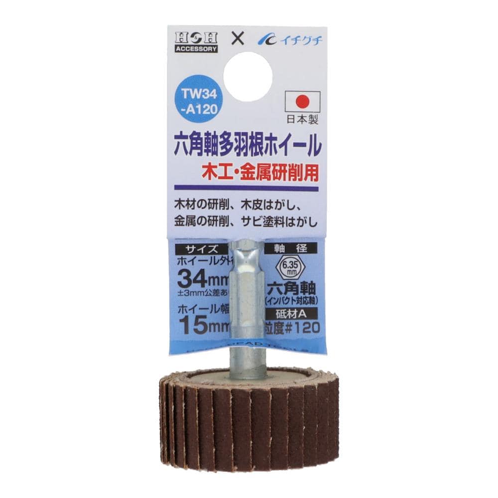 ●ホイール外径:34mm ●ホイール幅:15mm ●軸径:6.35mm ●砥材:アランダム ●粒度:#120 ●最高使用回転数: 3000r.p.m. 【用途】 ●木材の研削 ●木皮はがし ●金属の研削 ●サビ塗料はがし 【取付工具】 ●電気ドリル ●充電ドリル(インパクト対応軸)