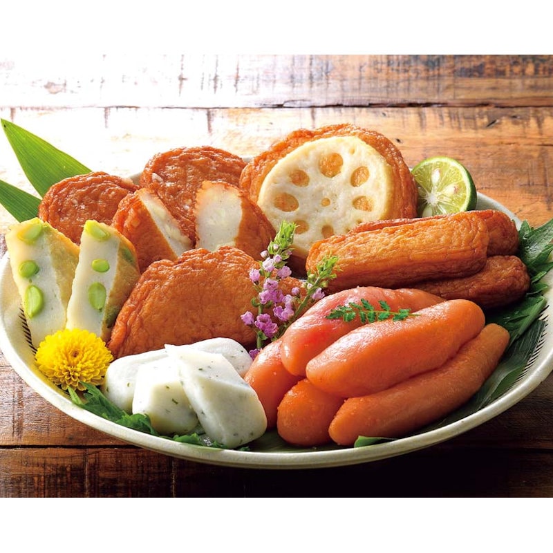 【セット内容】チーズ天30g・棒天20g×各3枚、しそ棒天20g×2枚、れんこん揚45g、枝豆天30g、桜島天50g、無着色辛子めんたいこ175g(ロシア又はアメリカ産原料を使用、福岡県にて加工)