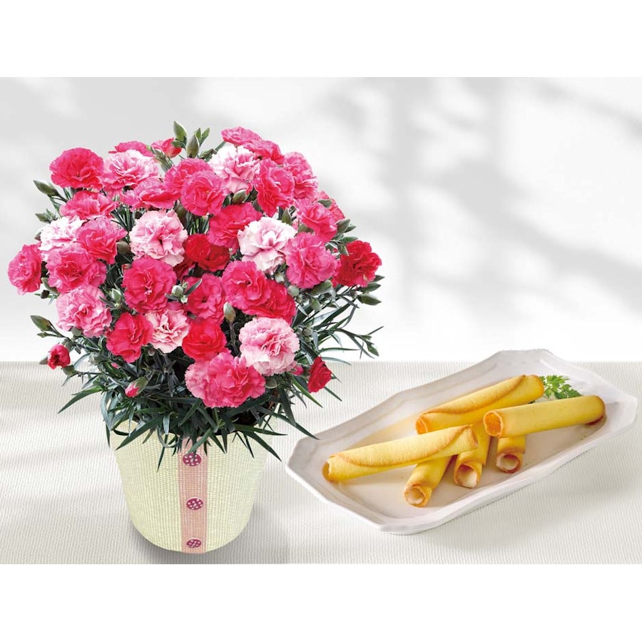 【セット内容】カーネーション5号鉢、バスケット、お手入れのしおり、ラングドロール×8 ”商品サイズ:幅約15cm×高さ約30cm”