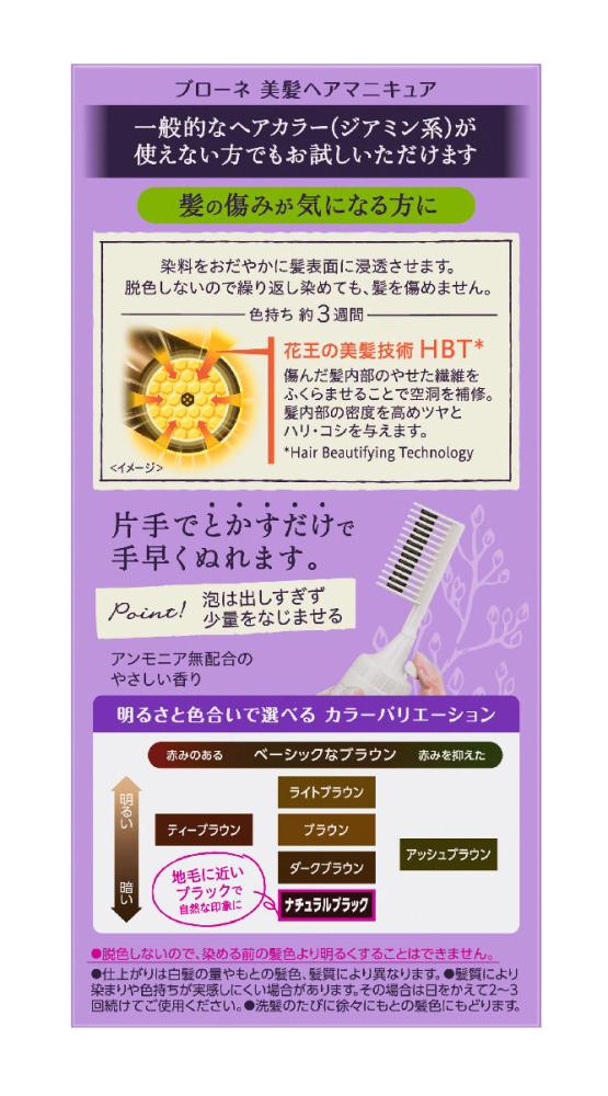 原材料・成分:(ブローネヘアマニキュア)成分:水、LPG、エタノール、ベンジルグリコール、乳酸、グリセリン、ヒドロキシプロピルキサンタンガム、DME、PEG-11メチルエーテルジメチコン、PEG-9ジメチコン、水添ポリイソブテン、(C12-14)s-パレス-9、香料、BG、水酸化Na、リンゴ酸、ローヤルゼリーエキス、加水分解シルク、ヒバマタエキス、黄203、黒401、紫401、赤227、橙205(花王リムーバー)成分:水、トリデセス-9、エタノール、ベンジルオキシエタノール、炭酸Na、炭酸水素Na
