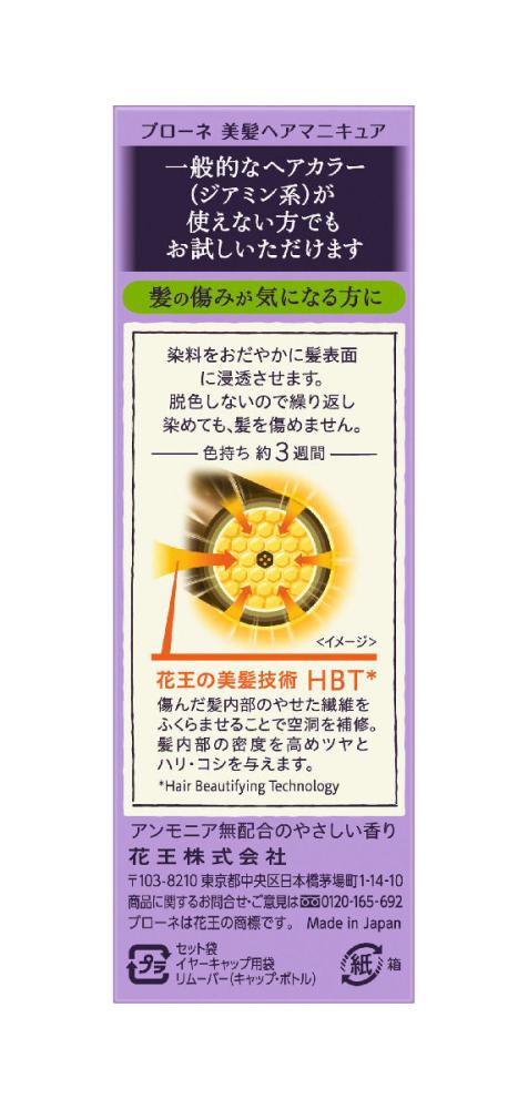 原材料・成分:(ブローネヘアマニキュア)成分:水、LPG、エタノール、ベンジルグリコール、乳酸、グリセリン、ヒドロキシプロピルキサンタンガム、DME、水添ポリイソブテン、PEG-11メチルエーテルジメチコン、PEG-9ジメチコン、(C12-14)s-パレス-9、香料、BG、水酸化Na、リンゴ酸、ローヤルゼリーエキス、加水分解シルク、ヒバマタエキス、黒401、赤227、橙205(花王リムーバー)成分:水、トリデセス-9、エタノール、ベンジルオキシエタノール、炭酸Na、炭酸水素Na