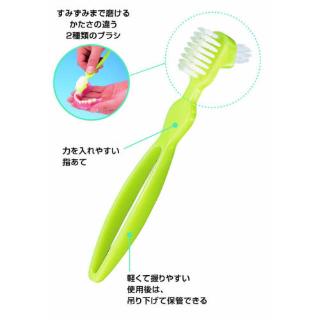 入れ歯の平らな部分、くぼんだ部分を2種類のブラシで、すみずみまできれいに磨けます。