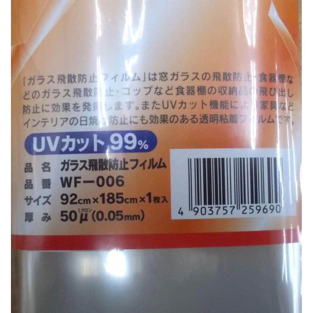 地震・台風対策用の窓ガラス飛散防止フィルム。食器棚や透明窓ガラスに貼り付け、ガラスが割れた時、周りに破片が飛び散らないようにします。スプレーを使用して貼り付ける水貼りタイプ。ガラスの飛散防止効果がありますが、条件によってはガラスが飛び散る場合があります。ヒビ割れたガラスに貼りますと、ガラスの破片で怪我をする場合があるので貼らないでください。