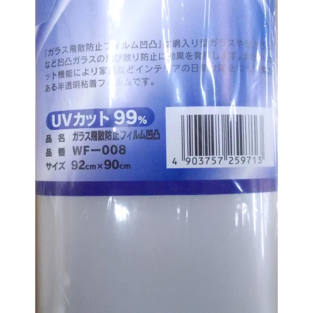地震・台風対策用の窓ガラス飛散防止フィルム。特殊粘着加工によりスリガラス・ドアの明りとり等の凹凸面に貼る事ができます。浴室のガラス扉など凹凸ガラスに貼り付け、ガラスが割れた時、周りに破片が飛び散らないようにします。裏紙をはがして貼り付ける粘着タイプ。ガラスの飛散防止効果がありますが、条件によってはガラスが飛び散る場合があります。ヒビ割れたガラスに貼りますと、ガラスの破片で怪我をする場合があるので貼らないでください。