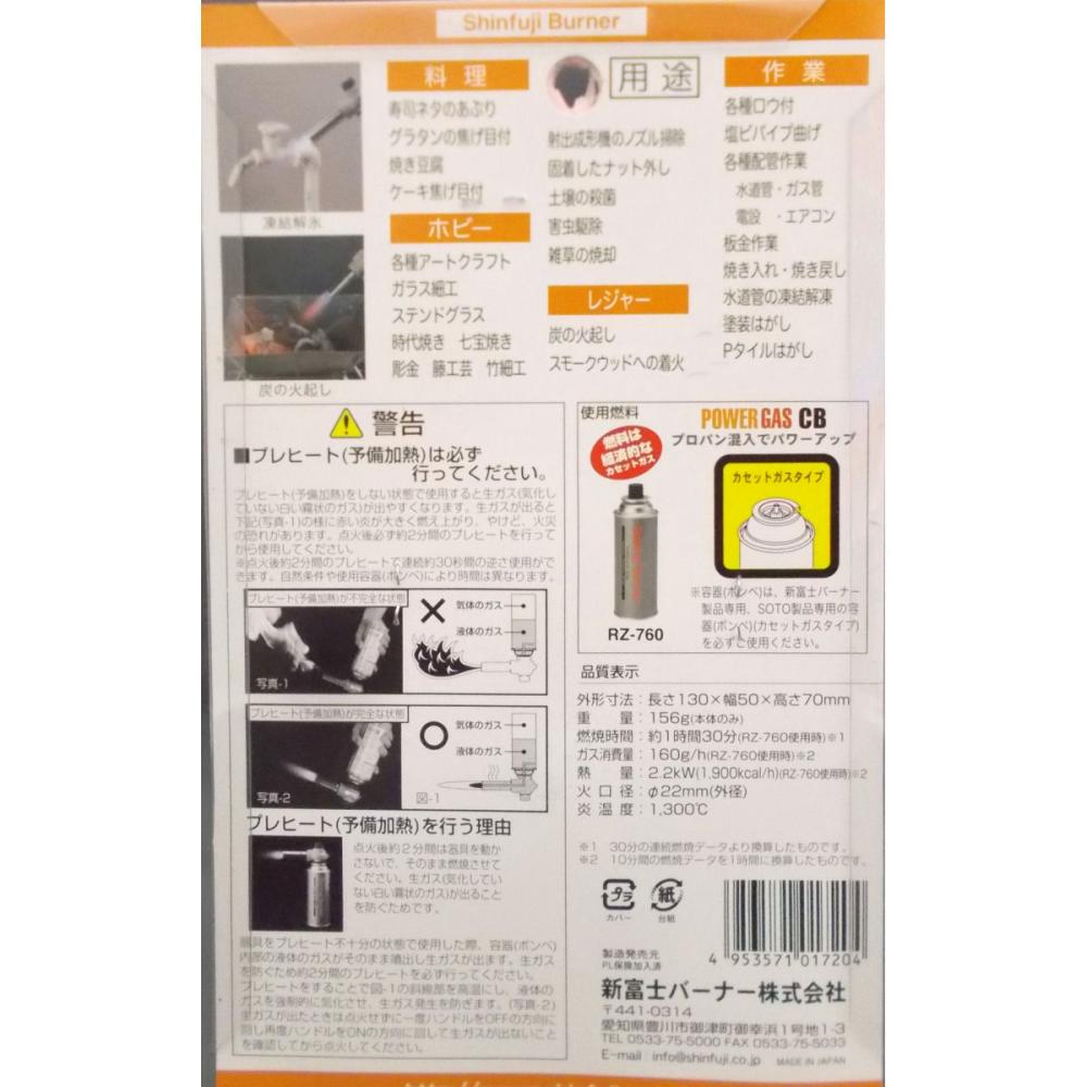 "仕様仕用燃料:カセットガス 火口径Φ22mm 火炎温度:1300℃ 熱量:2.2kW(1900kcal/h) 燃焼時間:約1時間30分ガス消費量:160g/h