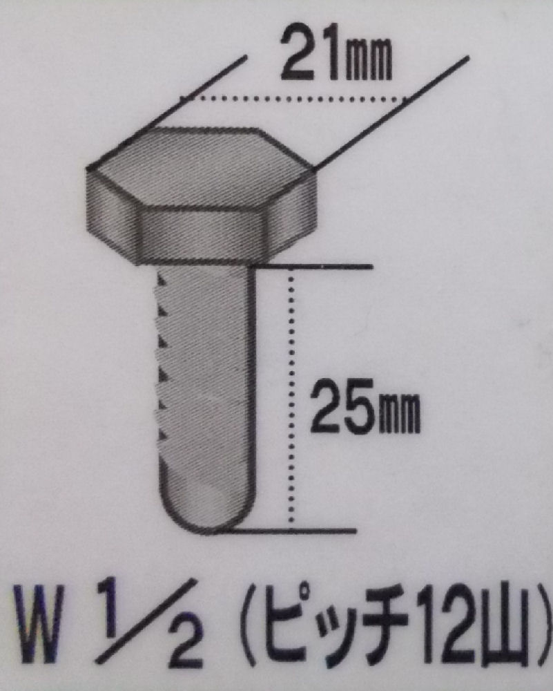 ●材質:鉄 ●ねじ山規格:ウィット:並目 ●表面処理:ユニクロ ●サイズ:1/2X25 ●太さ(内径):W1/2 ●太さ(外径):25 ●適応スパナサイズ:19 ●ねじピッチ:12山