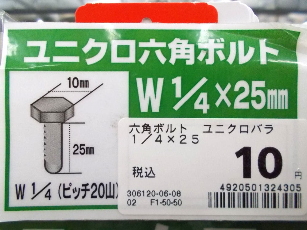 ●材質:鉄 ●ねじ山規格:ウィット:並目 ●表面処理:ユニクロ ●サイズ:1/4X25 ●太さ(内径):W1/4 ●太さ(外径):25 ●適応スパナサイズ:10 ●ねじピッチ:20山