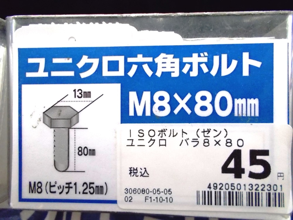 ●材質:鉄 ●ねじ山規格:メートル:並目 ●表面処理:ユニクロ ●サイズ:8X80 ●太さ(内径):8 ●太さ(外径):80 ●適応スパナサイズ:13 ●ねじピッチ:1.25