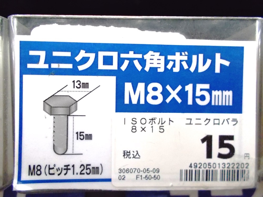 ●材質:鉄 ●ねじ山規格:メートル:並目 ●表面処理:ユニクロ ●サイズ:8X15 ●太さ(内径):8 ●太さ(外径):15 ●適応スパナサイズ:13 ●ねじピッチ:1.25
