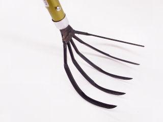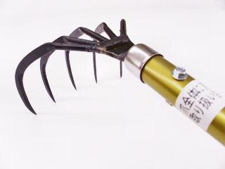 深さ10センチの爪で、田んぼの根強い雑草を引き抜く道具。長柄のため腰を曲げずに作業でき、太いパイプ柄は握りこみによる手の疲れを軽減します。