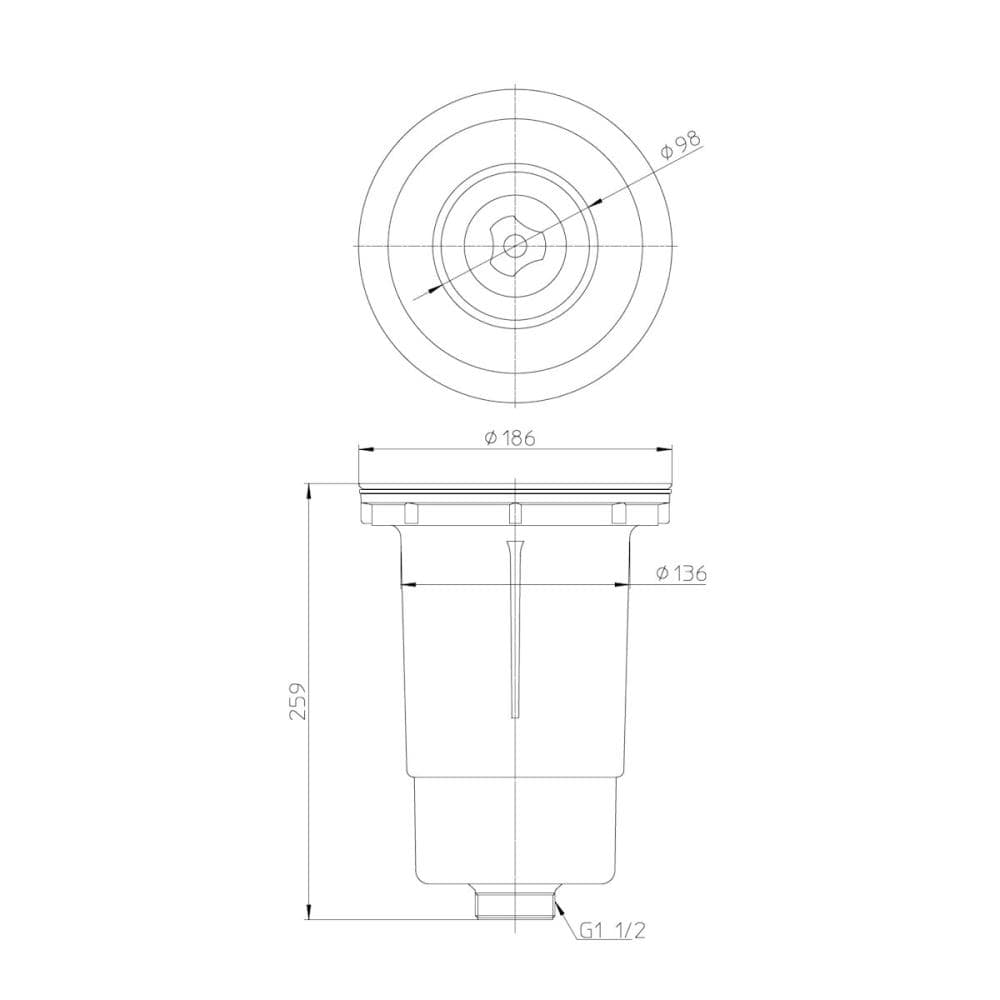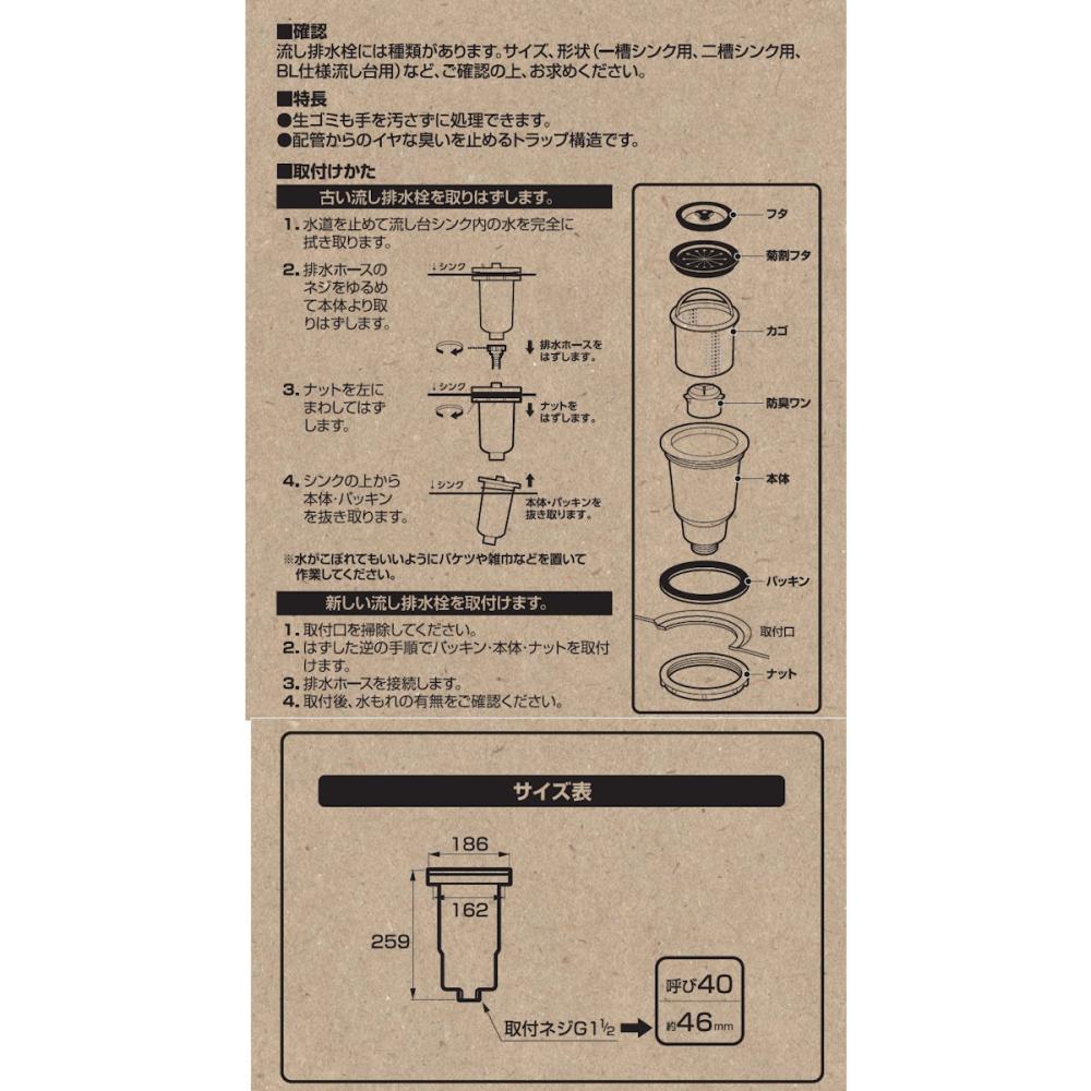 生ゴミも手を汚さずに処理できます配管からのイヤな臭いを止めるトラップ構造です排水栓取付ネジ径162mm下部取付ネジG1/2(呼び40、約46mm)締付工具R371(別売)