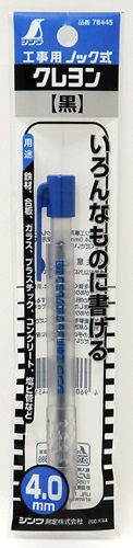 鋼材、ガラス、プラスチックなどへの書き込みに使用するクレヨン ・ノック式なので手が汚れません。 ペン型なので文字が書きやすいです。 ■色:黒 ■芯太さ:4.0mm ■ボトル:ABS樹脂