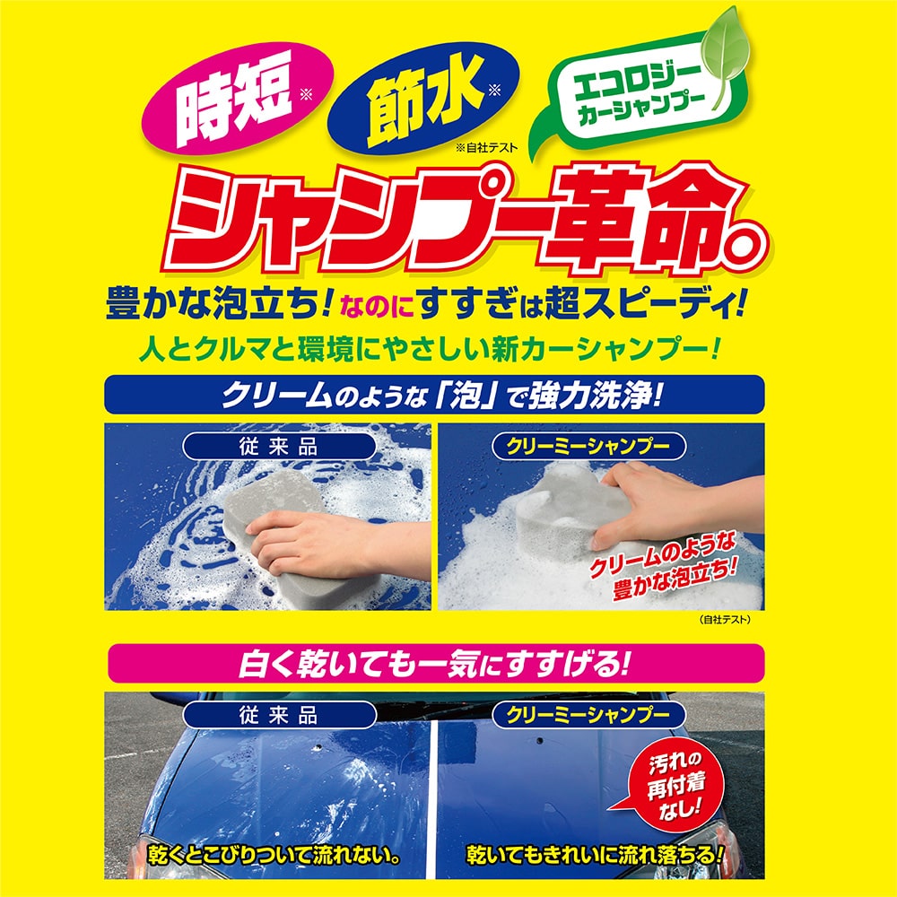夏場の洗車でもすすぎは最後に1回で完了しますので、洗車時間を短縮でき、きめ細かく豊富な泡立ちは強力な洗浄力と気持ちのよい使用感を生み出します。