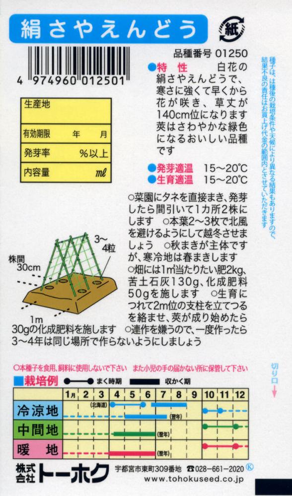 寒さに強く春先早くから花が咲き、莢はさわやかな緑色で食味の良い絹さや