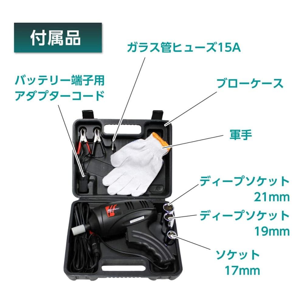 ■入力電圧:DC12V ■締め付けトルク:MAX340N・m ■DCコード長さ:約4m 【付属品】 ●ソケット(17mm) ●ディープソケット(19mm、21mm) ●軍手 ●バッテリー端子用アダプターコード