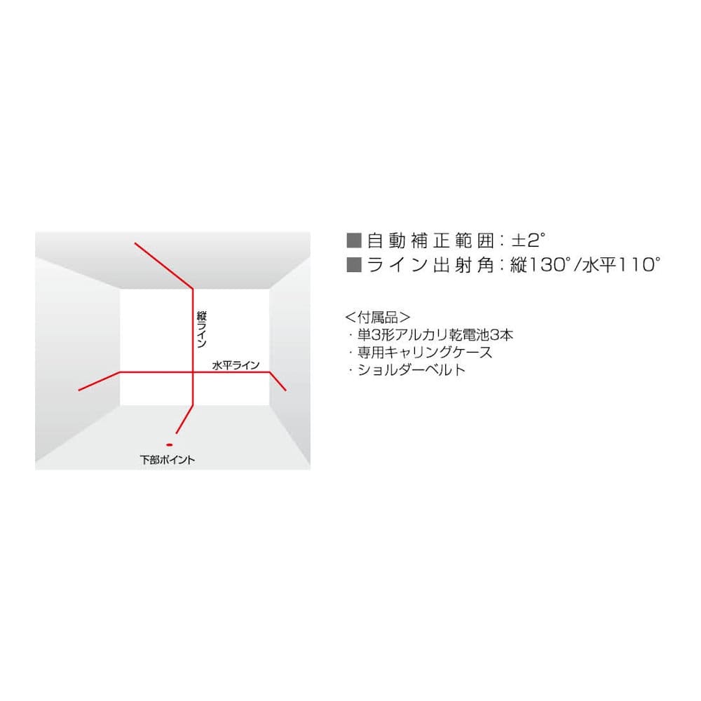 明るい場所でも見やすい高輝度レーザーです。精密な地墨合わせができる360度回転微調整機能付です。本体に直接三脚の取り付けができます。