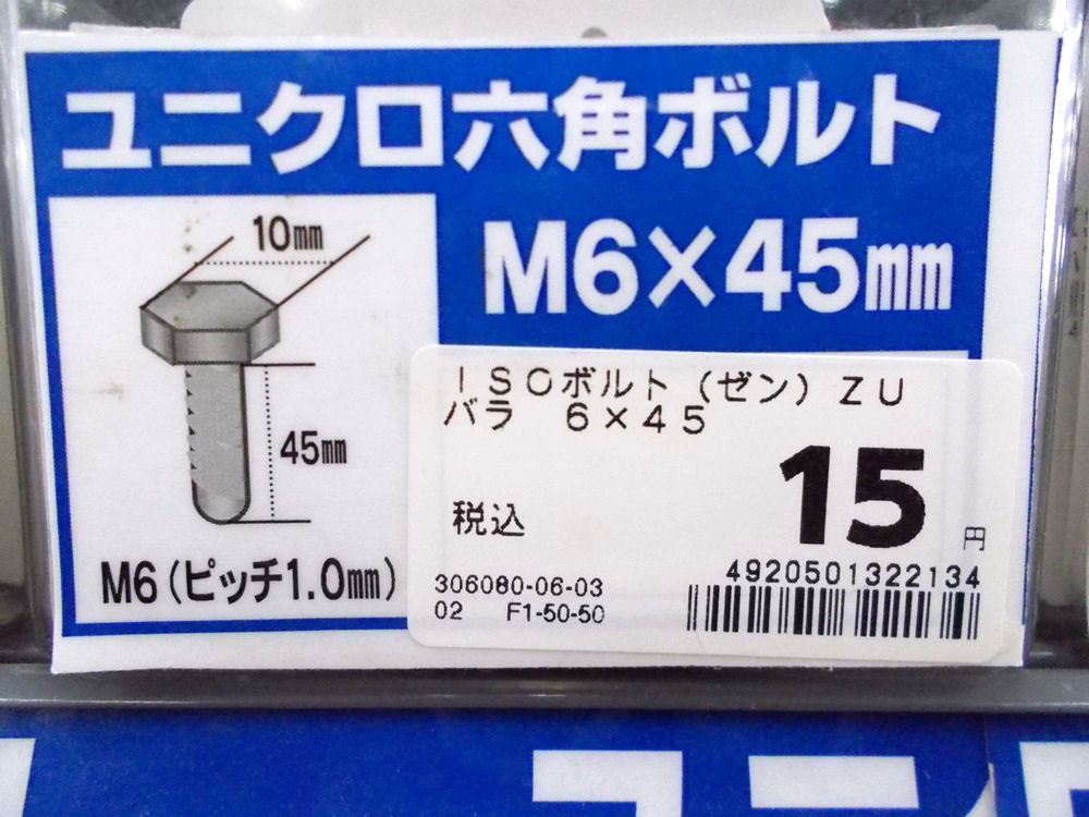 ●材質:鉄 ●ねじ山規格:メートル:並目 ●表面処理:ユニクロ ●サイズ:6X45 ●太さ(内径):6 ●太さ(外径):45 ●適応スパナサイズ:10 ●ねじピッチ:1