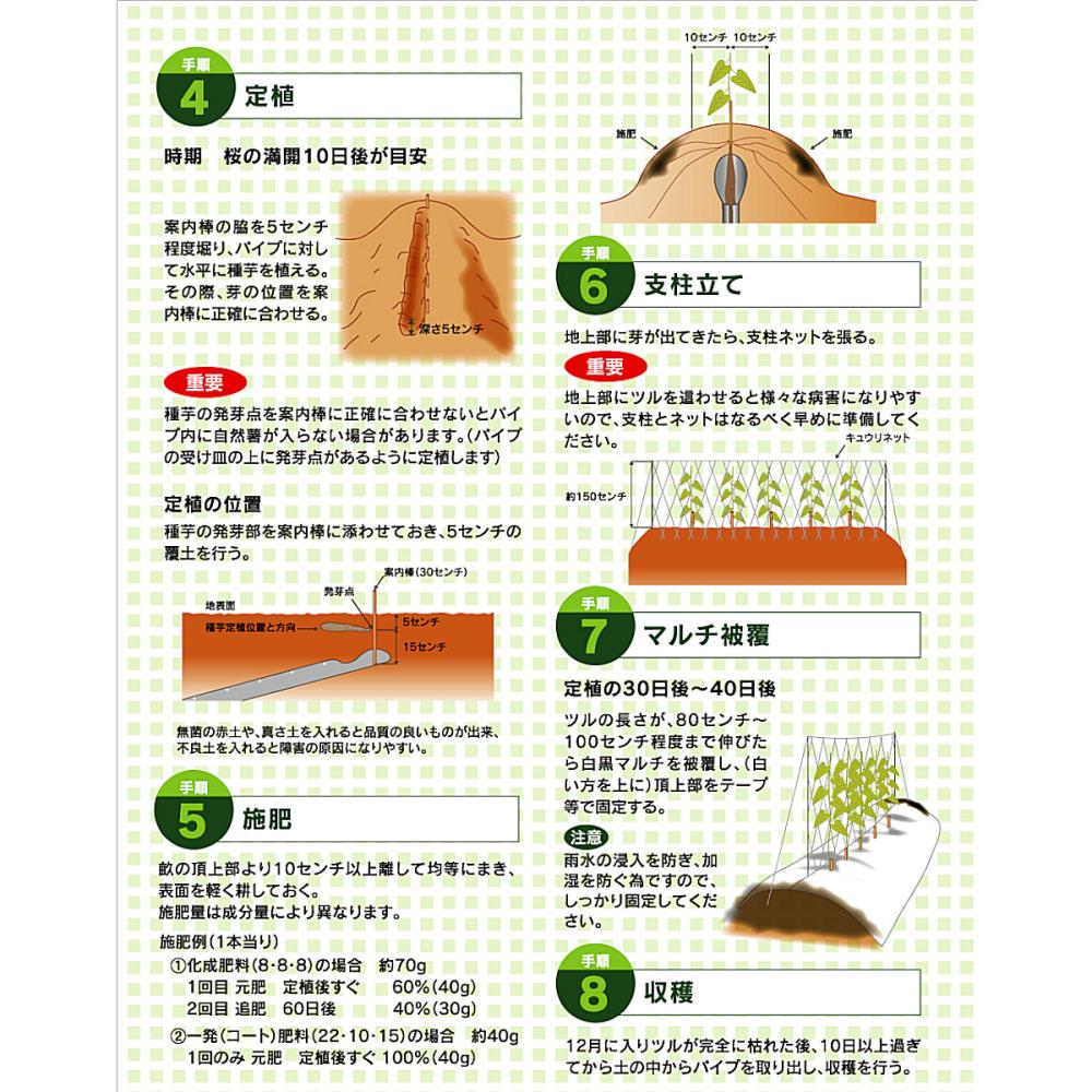 ・一本一本、パイプの中で育つから、パイプごと簡単に掘り取りができ、芋を傷つけることがありません。 ・パイプは繰り返し使えて経済的です。 ・畑を選ばず、連作が可能です。